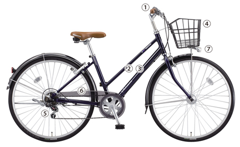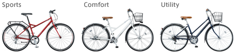 [Features] 1. Handlebar stem with fitted clock The handlebar stem is fitted with a clock that can also be switched across to display a calendar. Fitted with a backlight so that it is visible when dark, the display will allow the time to be checked even at night. ![]() 2. The Sporty Belt that provides a sense of sportiness when cycling. * The Sporty Belt is only available on the Comfort model. The main feature of the belt drive is that it is practically maintenance-free and does not need lubricating, nor is there any danger of it slipping off the drive. Another feature is the Sporty Belt, which was developed to provide a sense of sportiness when cycling. Combining the tension adjustment mechanism and the gear crank together has also provided a smaller external appearance to make it seem smarter than conventional models. ![]() 3. Equipped with practical equipment Fitted with a wide range of practical equipment, such as mudguards that protect the rider from splashing rainwater and mud, a rear carrier for carrying goods, tires that are able to resist punctures, and a two locks to prevent theft. 4. Complete with a three-year bicycle theft compensation plan for peace of mind The bicycle comes complete with our three-year bicycle theft compensation campaign, which guarantees that in the event of the bicycle being stolen the victim will be compensated with the same or similar model for a compensation handling charge of just 3,150yen (including tax.) [Features of the Sports Model] Targeting casual and stylish users who cycling for more than about thirty minutes (approximately 8km or more,) this model is the swiftest of the three models boasting both speed and practicality with 700C wheels that offer the same levels of speed performance as road bikes and fitted with mudguards, a stand, a lamp and a rear carrier. (1) Handlebar stem with fitted clock. (2) A frame design with enhanced speed when the rider is leaning slightly forward. (3) Inter-crossed aluminum frame designed in a sporty style. (4) 700C wheels for improved speed performance. (5) Bullhorn handlebars for which the location of the grips can be changed in accordance with cycling style. (6) Externally-positioned 8-speed gears manufactured by Shimano for smooth gear-changing performance. (7) A simple gear cover with a superior design to prevent trouser cuffs from getting caught. (8) Semi-block original block patterned tires that are durable against spike punctures. (9) A special rear carriers for carrying goods. (10) Sporty mudguards that do not detract from the external appearance of the bicycle. (11) Compact LED battery lamp. ![]() [Features of the Comfort Model] A comfortable commutation models that is both practical and comfortable to ride targeting office and school commuters who commonly cycle between approximately twenty and thirty minutes, equipped with a basket for carrying business bags and with a sporty belt that is practically maintenance-free for enhanced comfort. (1) Handlebar stem with fitted clock. (2) A frame design that enables easy riding so that the shoulders do not feel uncomfortably tight when wearing suits. (3) A sporty, inter-cross aluminum frame. (4) A simply-designed front basket with plenty of room for business bags. (5) Fitted with the Sporty Belt, which provides a sense of directness for sporty cycling. (6) Built-in 3-speed or 8-speed gears manufactured by Shimano for smooth gear-changing performance. (7) Mighty Road Plus tires with a back protector to reduce the risk of spike punctures. (8) LED White Flash Mini 1W Tentomushi lamp (hub-dynamo) that does not require batteries and that is illuminated automatically. (9) The front wheel has an individual form that places the emphasis on design with a specially-woven style of spokes. ![]() VC73BT [Features of the Utility Model] The most general-purpose and practical commutation model with an inexpensive price targeting all types of short-distance commuters who need to cycle for twenty minutes (approximately 5km) or less. (1) Handlebar stem with fitted clock. (2) A frame design that enables easy riding so that the shoulders do not feel uncomfortably tight when wearing suits. (3) An easy-to-pedal inter-cross aluminum staggered frame. (4) A simply-designed front basket with plenty of room for business bags. (5) Externally-positioned 6-speed gears manufactured by Shimano for smooth gear-changing performance. (6) A semi-transparent chain case to prevent trouser cuffs from getting soiled. (7) LED White Flash Mini 1W Tentomushi lamp (hub-dynamo) that does not require batteries and that is illuminated automatically, or an LED new White Flash Dynamo lamp (block dynamo.) ![]() VU66T |