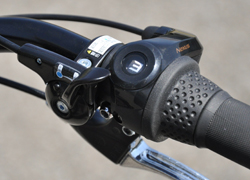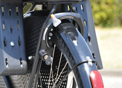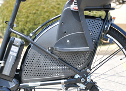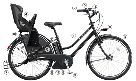 [Features of the HYDEE.B] 1. Loop-shape aluminum frame that ladies will find easy to pedal The design involves a loop shape at the top of the frame for easy pedaling and a straight shape at the bottom to create a sporty form. It has also been given a sturdy design with a 30% increase * in rigidity over conventional frames to reduce warping and wobble. * In comparison with the Class-18 frames manufactured by Bridgestone. ![]() 2. Cruiser handlebars for relaxing and comfortable cycling Cruiser-type handlebars produced especially for the HYDEE.B. This allows the rider to sit is a relaxed and comfortable position. ![]() 3. Center-slick MTB tires for increased safety through weight resistance. The 26-inch x 1.95HE MTB tires have plenty of air volume for increase weight resistance, providing greater peace of mind when carrying children. The center-click function also provides a lighter and more comfortable ride. ![]() 4. Handsome child seat supplied with two cushion patterns A newly-developed child seat aiming at both greater levels of design and safety. Meeting all SG specifications, the seat is fitted with a head guard, foot guards and other features that can be adjusted in accordance with the growth of the child. Boasting a design that makes the best use of curves, the seats also come in three cushion designs featuring camouflage colors, red and black. Each of the models is supplied with two patterns; camouflage and red for the T.X. matt black frame color, camouflage and black for the E.X. white frame color and camouflage and red for the F.X. active red frame color. The seat can be used by children between the age of two and six with a height of 115cm or less and a weight of 22kg or less. ![]() 5. Large foot guards finished with ventilation holes to protect children's feet Fitted with food guards finished with ventilation holes to protect children's feet in the event of danger as part of the standard specifications. ![]() 6. Temoto-de-Lock II function to prevent the bicycle from toppling over Prevents the risk of the handlebars unexpectedly moving and the bicycle toppling over when parked and unloading goods. Finished in a color-coordinated black. ![]() 7. Super crank wide stand to prevent the bicycle from toppling over The super crank wide stand has additional width to prevent the bicycle from toppling over when parked. Using the lever principle, it is also possible to easily activate the stand when a child is sitting in the child seat. ![]() 8. White flash mini 1W LWD Tentomushi A shell-shaped LED lamp that is illuminated automatically and does not require batteries is fitted above the front wheel. With its 1W of power, it is very bright and easily illuminates the road ahead. (It is situated beneath the front basket when one has been fitted.) ![]() 9. Aluminum pedals with imbedded reflectors The pedals are made of aluminum and boast durable imbedded reflectors for a smart design. ![]() 10. Easy to operate cycle lock An extremely broad and very tough "BS Lock III" anti-theft cycle lock operated with a dimple key is fitted below the rear carrier. The lock can also be opened from the rear when parked. ![]() 11. Main switch equipped with a digital display Battery capacity is displayed in units of 10% down until 20% remains, and then in units of 1% for the remaining 20%. The switch alternates between this and the speed display to eradicate anxieties over remaining battery capacity and estimated time of arrival to provide an even higher sense of security. ![]() 12. "Long-life battery" with approximately double the life of conventional models The life-span of conventional batteries (replacement period) was between 350 and 450 recharges, but this long-life battery has doubled this life-span to between 700 and 900* recharges. This means that the total distance that can be cycled with a single battery has been doubled, which provides an economical purchase from the point of view that the extra life represents a full replacement battery with conventional models. The shape of the battery has also been upgraded to enable it to be connected and disconnected with even greater simplicity. * This figure is a yardstick. The conditions under which this yardstick were established involve an annual recharge count of 200 cycles when used in the standard pattern at a temperature of 25 degrees Celsius. (1 cycle = a full charge after the battery has been allowed to run out.) ![]() 13. "S.P.E.C.3" providing finely-tuned assistance in alignment with the gear Uses the "S.P.E.C.3" (Shift Position Electric Control x three built-in gears) function to provide superior assistance power. The speed sensor enables the drive unit to detect the gear and speed. This controls the ultimate level of assistance power in alignment with each of the three gears. Simply change gears in accordance with road conditions, and this function will provide the ultimate cycling experience by providing the maximum amount of assistance power. 14. The assistance mode can be selected from the "Auto-Eco Mode Plus" in accordance with the cycling scenario. Automatically detects the amount of pressure applied to the pedals in order to automatically control the assistance power. This provides the perfect support by applying power when needed and by saving battery power when not needed under all conditions, including when riding up steep gradients, when riding into head winds and when on extended journeys. In addition, it is also possible to select either the [Strong Mode] for increased power and the [Standard Mode] that makes the best use of both power and distance. 15. Aluminum housing drive unit. Assistance level ![]() Uses an aluminum housing drive unit with improved levels of silence. Extremely powerful with an assistance level of ![]() * The assistance level represents the amount of available assistance power. Levels differ between models. 16. Warranty on main parts A warranty on main parts has been added for peace of mind, with a two-year warrant