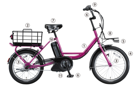 [Features of the JOSIS-WGN E.A. Model] 1. Underborn frame with a low base and low center of gravity design Underborn frame with a low base, low center of gravity and long wheel-base design that is easy to pedal and that provides stability when cycling even when heavy loads are being carried in the rear basket. ![]() 2. Large container-style rear basket (with dot-patterned basket cover) The large container-style rear basket comes equipped with a dot-patterned cover to prevent the contents from falling out. Basket dimensions: Top area 400 × 300mm, base area: 360 × 250mm, height 180mm ![]() 3. Different sized tires, with a 20-inch front tire and an 18-inch rear tire The smaller rear tire provides stability when loading or unloading goods from the basket and when cycling while carrying heavy loads. ![]() 4. Fat 2.125HE tires Fitted with wide tires with an approximate width of 5.4cm for added stability. ![]() 5. White Flash Mini battery lamp Fitted with a rounded, fashionable shell-shaped LED battery to enable safe cycling at night. ![]() 6. BMX-style handlebars and pedals Finished in the BMX style with handlebars that can be gripped from a relaxed position and easy-to-pedal, wide pedals. ![]() 7. A Big Terry saddle designed in the classical style A Big Terry saddle designed in the classical style. The studs on the saddle provide a sense of nostalgia. ![]() 8. A front carrier to which the optional basket can be installed Fitted with a front carrier so that a basket can be installed at the front. ![]() 9. Near at hand 3-mode panel switch A panel switch located conveniently on the handlebars that displays the remaining battery capacity in four stages and that can be used to switch between the Standard mode, the Auto Eco Mode Plus and the Strong mode assistance levels. ![]() 10. Long-life battery with approximately double the life of conventional models The life-span of conventional batteries (replacement period) was between 350 and 450 recharges, but this long-life battery has doubled this life-span to between 700 and 900* recharges. This means that the total distance that can be cycled with a single battery has been doubled, which provides an economical purchase from the point of view that the extra life represents a full replacement battery with conventional models. The shape of the battery has also been upgraded to enable it to be connected and disconnected with even greater simplicity. * This figure is a yardstick. The conditions under which this yardstick were established involve an annual recharge count of 200 cycles when used in the standard pattern at a temperature of 25 degrees Celsius. (1 cycle = a full charge after the battery has been allowed to run out.) ![]() 11. "The Auto Eco Mode Plus" that automatically controls the assistance power in accordance with all traveling scenarios When [Auto Eco Mode Plus] is selected from "the three assistance modes" that determine traveling performance, pressure on the pedals is automatically detected to provide automatic control over the assistance power. This provides the perfect support by applying power when needed and by saving battery power when not needed under all conditions, including when riding up steep gradients, when riding into head winds and when on extended journeys. In addition, it is also possible to select either the [Strong Mode] for increased power and the [Standard Mode] that makes the best use of both power and distance. 12. Warranty on main parts A warranty on main parts has been added for peace of mind, with a two-year warranty on the battery and a three-year warranty on the frame, the front forks and the drive unit. 13. Complete with three-year theft compensation package In the event of the bicycle being stolen within three years of purchase, 70% of the standard cash retail price will be discounted off a new bicycle. 14. BAA Standards Manufactured with environmentally-friendly parts that conform to "the BAA (Bicycle Association (JAPAN) Approved) standards" that were voluntarily established by the bicycle industry. http://www.baa-bicycle.com/index.html ![]() JOSIS-WGN E.A. Specification Sheet 1. Underborn frame with a low base and low center of gravity design 2. Large container-style rear basket 3. Different sized tires, with a 20-inch front tire and an 18-inch rear tire 4. Fat 2.125HE tires 5. White Flash Mini battery lamp 6. BMX-style handlebars and pedals 7. A Big Terry saddle designed in the classical style 8. A front carrier to which the optional basket can be installed 9. Near at hand 3-mode panel switch 10. "Long-life battery" with approximately double the life of conventional models 11. "The Auto Eco Mode Plus" that automatically controls the assistance power in accordance with all traveling scenarios. Assistance Level: ![]() * The assistance level represents the amount of available assistance power. Levels differ between models. ![]() [Main Specifications]