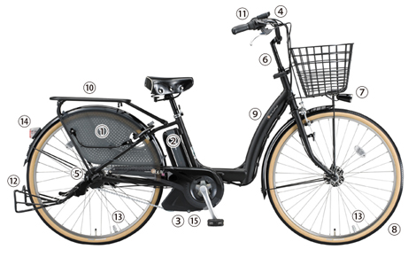 *2: Scheduled for sale in August 2011 <New Features of the BEAUTÉ ASSISTA DX> 1. Newly-developed, large foot guards to protect the child's feet Large foot guards to protect the child's feet from all eventualities when the rear child seat is attached. The guards are perforated to lower wind resistance and prevent wobbling when the wind is blowing. ![]() 2. Long-life battery with approximately double the life of conventional models The life-span of conventional batteries (replacement period) was between 350 and 450 recharges, but this long-life battery has doubled this life-span to between 700 and 900* recharges. This means that the total distance that can be cycled with a single battery has been doubled, which provides an economical purchase from the point of view that the extra life represents a full replacement battery with conventional models. The shape of the battery has also been upgraded to enable it to be connected and disconnected with even greater simplicity. * This figure is a yardstick. The conditions under which this yardstick were established involve an annual recharge count of 200 cycles when used in the standard pattern at a temperature of 25 degrees Celsius. (1 cycle = a full charge after the battery has been allowed to run out.) ![]() 3. Aluminum housing drive unit Equipped with an aluminum housing drive unit that provides improved levels of silence. 4. Main switch equipped with a digital meter Battery capacity is displayed in units of 10% down until 20% remains, and then in units of 1% for the remaining 20%. The switch alternates between this and the speed display to eradicate anxieties over remaining battery capacity and estimated time of arrival to provide an even higher sense of security. ![]() 5. Aurora brakes fitted with high-performance heat discharge fins Built-in aurora brakes with high levels of performance that are not affected by rainy days. High-performance heat discharge fins have been newly fitted to prevent grease running out during cooling to improve durability. ![]() 6. Black parts on T. Matte Black colors favored by fathers A sense of color unity has been attained with a combination of black parts against a background of new T. Matte Black colors that are favored by fathers. The black parts are used in combination with T. Matte Black, M. Jewel Brown and P. Prism Wine, and silver parts have been used in combination with E. Cream Ivory and E. Grass Green. ![]() 7. White Flash Mini 1W Battery Lamp 1W battery lamps are fitted to all models as standard equipment. This enables carefree cycling on night roads. ![]() 8. E. Mighty Road 4.5 tires with superior levels of anti-wearing performance that provide a light and easy ride The E. Mighty Road 4.5 front and rear tires are fat (1-1/2) and have high pressure (4.5 atmospheres,) and boast superior levels of anti-wearing performance that provide a light and easy ride. [ BEAUTÉ ASSISTA DX Features] 9. Open wide tough frame The low center of gravity open wide frame allows easy mounting when wearing skirts and prevents the knees from coming into contact with the front child seat, and has been designed with a tough frame * providing the required strength, rigidity and safety levels for when three people (rider + two children) are on the bicycle to prevent warping and wobble. * Approximately twice the rigidity of the regular Class 18 frames manufactured by Bridgestone. 10. Rear pipe carrier to which a rear child seat can be attached The rear pipe carrier is rigid and conforms to Class 27 levels (maximum load of 27kg) for securely attaching the special rear child seat. 11. Temoto de Lock II to prevent toppling This enables the handlebars to be locked with a near-at-hand switch without taking the hands from the handlebars. It avoids the risk of the bicycle toppling over owing to the unexpected rotation of the handlebars when parked or when unloading baggage. 12. Super Raku-raku Wide Stand to prevent toppling The wide Super Raku-raku Wide Stand prevents the bicycle from toppling over when parked. The stand can easily be activated even when children are still on the bicycle with the application of the pivot and lever principle. 13. Air Pressure Miharu-kun that informs the owner of low air pressure A red indicator informs the owner that there is insufficient air in the tires. Maintaining appropriate levels of air in the tires results in improved anti-wearing performance. 14. Solar power and automatically flashing "Solar Tail Lamp II" Equipped with "the Solar Tail Lamp II", which is fitted with two high-visibility LEDs that flash automatically and operate on solar power. 15. "The Auto Eco Mode Plus" that automatically controls the assistance power in accordance with all traveling scenarios When [Auto Eco Mode Plus] is selected from the three assistance modes that determine traveling performance, pressure on the pedals is automatically detected to provide automatic control over the assistance power. This provides the perfect support by applying power when needed and by saving battery power when not needed under all conditions, including when riding up steep gradients, when riding into head winds and when on extended journeys. In addition, it is also possible to select either the [Strong Mode] for increased power and the [Standard Mode] that makes the best use of both power and distance. 16. Warranty on main parts A warranty on main parts has been added for peace of mind, with a two-year warranty on the battery and a three-year warranty on the frame, the front forks and the drive unit. 17. Complete with a carefree accident insurance package and a three-year theft compensation package The bicycle comes complete with a compensation service package to cover injuries in the event of accidents while cycling, and a three-year theft compensation package that will discount 70% of the standard cash retail price off a new bicycle in the event of the bicycle being stolen within three years of purchase. 18. Conforms to two-child passeng
