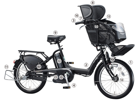 Angelino series. The Angelino has been certified as conforming to the safety standards for bicycles ridden with two child passengers by the Bicycle Association (Japan,) and being equipped with a special child seat at the front, it is a child care bike to support young mothers. The Angelino is a top brand that has become a byword for bicycles that can carry children, and it has been supported for many years by fans of the series, with 300,000 units already sold. The main feature of the PETITE ASSISTA is that it has been designed with a low center of gravity with the use of 20-inch diameter fat tires, which provides it with high levels of stability and makes it easy to control and difficult to topple over even when loaded with two children. These stable tires are known as Gotsuku Futoku Sporty tires. Despite the small diameter of the tires, they have ample air volume to provide vibration suppression and stability on rough roads, and anxiety-free levels of load durability even when three people weighing up to 100kg are on the bicycle. The frame was also developed from scratch together with the tires. The low center of gravity provides excellent handling balance and a comfortable, carefree ride both on the straights and on the bends. In addition, the shape of the open wide frame makes the bicycle easy to pedal when wearing a skirt and prevents the knees from coming into contact with the front child seat, even when men are riding, and it has a durable and tough aluminum frame with sufficient strength, rigidity and stability to carry three people (the rider and two children.) We also factored ease-of-use of a daily basis for mothers into the design. The child seats are located low on the bicycle to enable children to be placed on and lifted off both the front and rear seats smoothly (the lowest design of all 3-seater bicycles (*)). The position of the saddle is also the lowest of all 3-seater bicycles (*3) to enable both feet to be placed firmly on the ground, and this provides easy mounting and dismounting for the ladies. The front child seat is equipped with a reclining function, the first of its type developed within the industry. It is also fully equipped with all functions to guarantee the safety and comfort of children, including a head-guard that will protect the child's head in the event of the bicycle toppling over, adjustable head-guard and footrests that take the growth of the child into consideration, and a handlebar locking device and wide stand to prevent the bicycle from toppling over when parked. This motor-assisted functions include a main switch equipped with a digital meter that is located near at hand for easy operations, the S.P.E.C.3. function, which provides finely-tuned assistance in alignment with the gears, and the Auto Eco Mode Plus function that automatically controls the assistance power in accordance with all cycling scenarios. The Angelino PETITE ASSISTA is one of a total of four small-diameter motor-assisted bicycles for three riders (rider + two children) and normal bicycles in the PETITE series, all of which will be released on nationwide sale. * In comparison with other Bridgestone bicycles as of May 31, 2012. <Overview of Sales for the PETITE Series> Sales Area: Nationwide Annual Sales Target: 10,000 units (total) Date of Release: June 08 Standard Cash Retail Price: 69,800 yen to 141,800 yen (including tax) ![]() PETITE ASSISTA POSH T. Matt Black Product Configuration