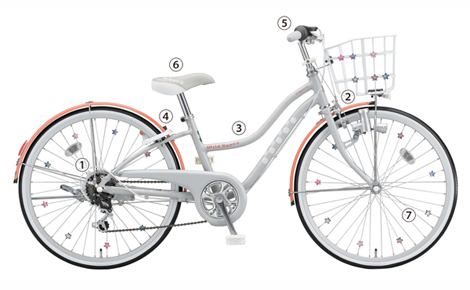 [Specification Sheet] The durable and lightweight aluminum frame is equipped with high-quality brakes to guarantee child safety (1) Rear brake: Newly-designed frist brake that provides gentle braking even in rainy weather These brakes were developed by Bridgestone. The feature greatly improved braking power in comparison to roller brakes and drum brakes. They also stop the bicycle with minimal pressure and without squeaking even in rainy weather. (2) Front brake: Double-pivot aluminum caliper brake that provides powerful braking power with light pressure. A brake mechanism that completely stops the bicycle with minimal pressure. High-class aluminum has been used for these girls' bicycles; a first for Bridgestone. (3) Durable, light-weight aluminum frame. (4) An easy-to-operate cylinder cycle lock with a safety mechanism. (5) A road-type dynamo remote-control lever that can be operated from the handlebars. (Only available on model code WB4T2: Fitted with the White Flash Rim II Tentomushi lamp that uses bright white LEDs.) (6) Directly-attached saddle that enables easy mounting even for small children (durable and fitted with a protector.) (7) Light-weight, easy-to-ride aluminum rims. * Fitted with the BAA (Bicycle Association Authorization) Mark This model conforms to the BAA (bicycle safety standards) enacted by the Bicycle Association. The new BAA standards enacted in 2008 require that no parts contain toxic substances that can have adverse effects on the global environment. http://www.baa-bicycle.com/index.html ![]() |